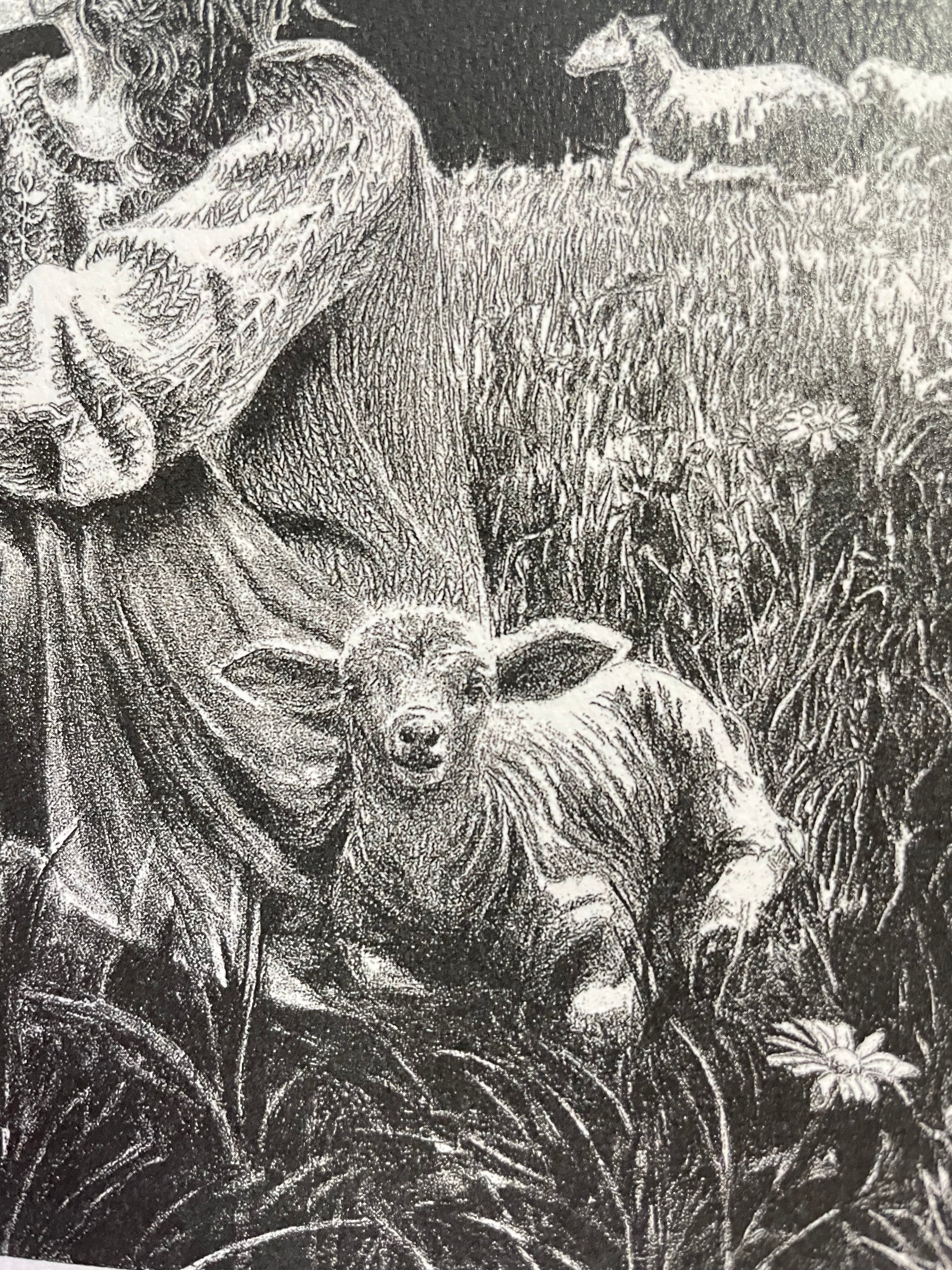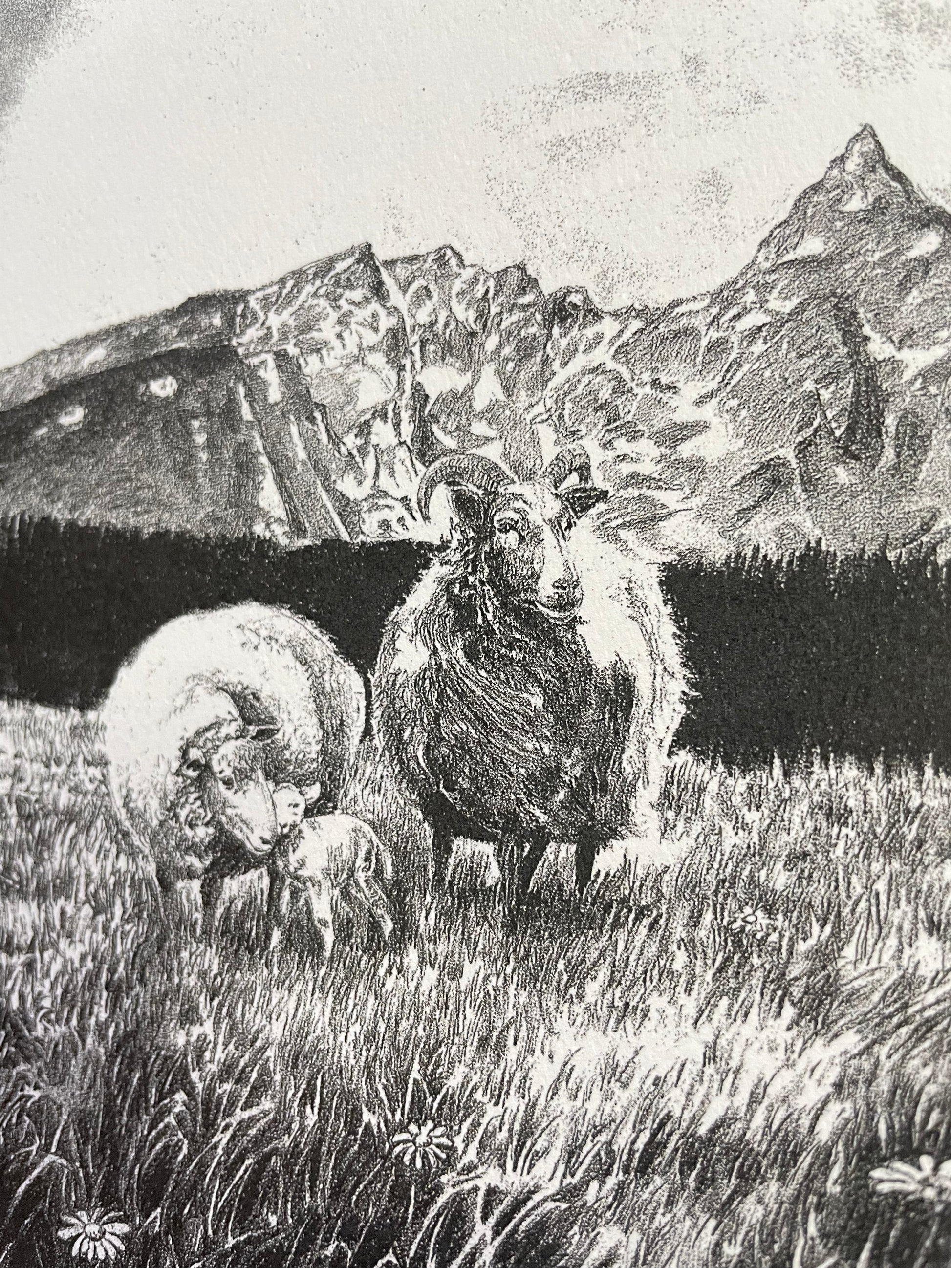 Capture the serene beauty of pastoral life with this evocative charcoal drawing art print. The composition features a contemplative girl standing amid a sunlit field, tending to grazing sheep while majestic mountains rise dramatically in the distance. Rendered in rich charcoal tones, the piece conveys both intimacy and expansive landscape, inviting viewers into a moment of quiet connection with nature. Perfect for those who appreciate fine art that celebrates rural traditions and natural beauty.